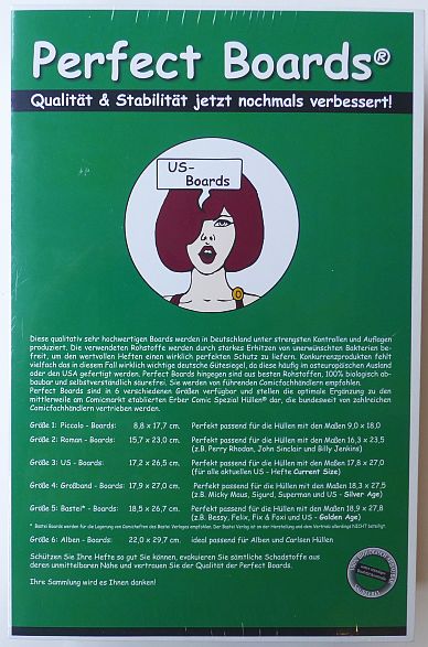 Weiße Kartonscheiben zum Verstärken der Hefte bei Hüllenaufbewahrung. Größe 17,2 x 26,5 cm, passend für Großband Schutzhüllen und US Current Size Schutzhüllen.Backing Boards sind stabile weiße Karton-Scheiben, die sich zum Verstärken von Hüllen eignen. Das Board wird hinter das Heft (mit der glatten Seite zum Heftrücken) in die Hülle gesteckt und sorgt durch die Stabilität für zusätzlichen Schutz.Die Boards sind - aus stabilem 415 g/m² Karton gefertigt - beidseitig weiß, einseitig matt-glatt beschichtet - säurefrei und damit archivierungsssicher - 100% biologisch abbaubar